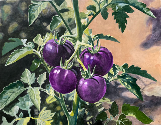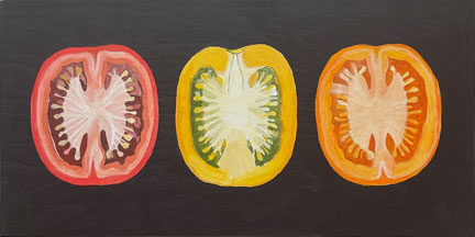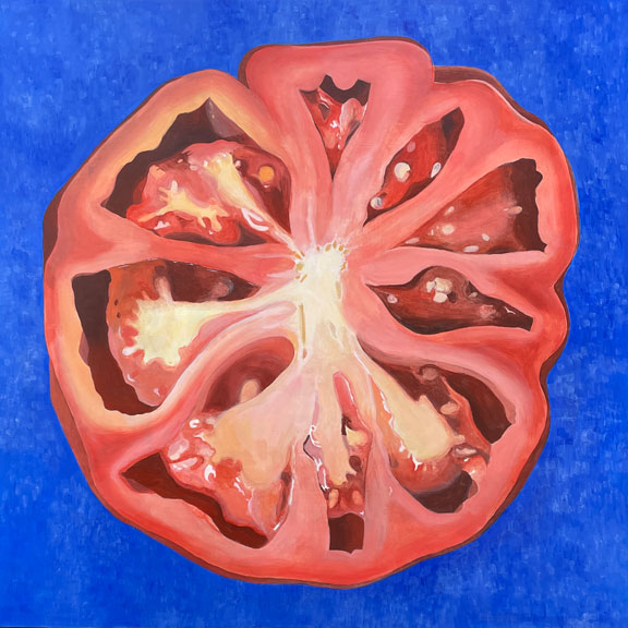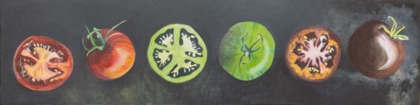 Tomatoes • 2026 From the Giant’s Garden • 30X30″ • Acrylic on panel Jazz Hands • 6X6″ • Acrylic on panel Tomato Circuit • 6X24 • Acrylic on panel Three Halves • 6X12″ • Acrylic on panel Summer Comfort • 8X8″ • Acrylic on panel Nightshade Quartet • 14X18″ • Acrylic on panel Share this: Share on X (Opens in new window) X Share on Facebook (Opens in new window) Facebook Like Loading...